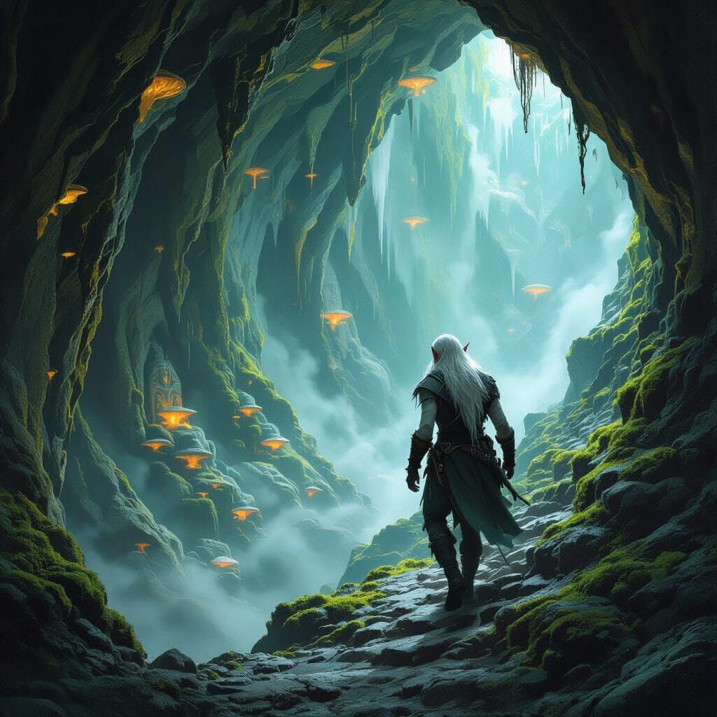 An albino elf explorer ventures into an ancient cavern lit by glowing fungi. The dark fantasy concept art style emphasizes mystery and foreboding, with dramatic lighting and ancient carvings.