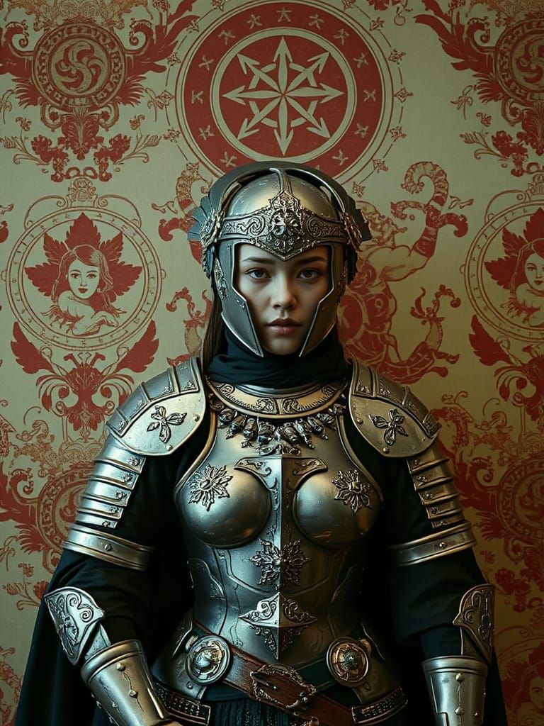 A striking picture of a woman in ornate armor. The armor features Chinese and fractal ceramic elements, presented in a pop japonisme style with a horror wallpaper backdrop.
