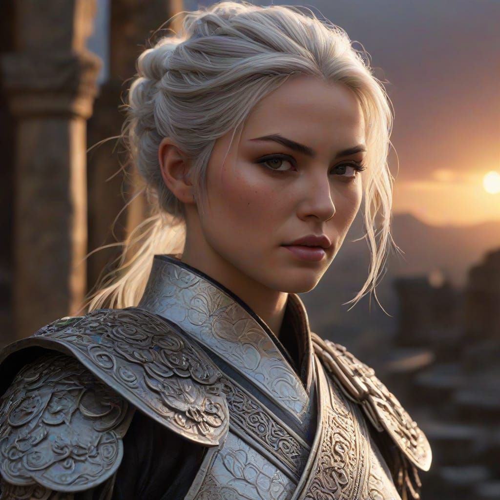 This image showcases a high-fantasy, hyper-realistic scene of a European female samurai dueling a masked warrior under a vibrant sunset with dramatic skies. The artwork features intricate details, luxurious fabrics, and photorealistic textures.