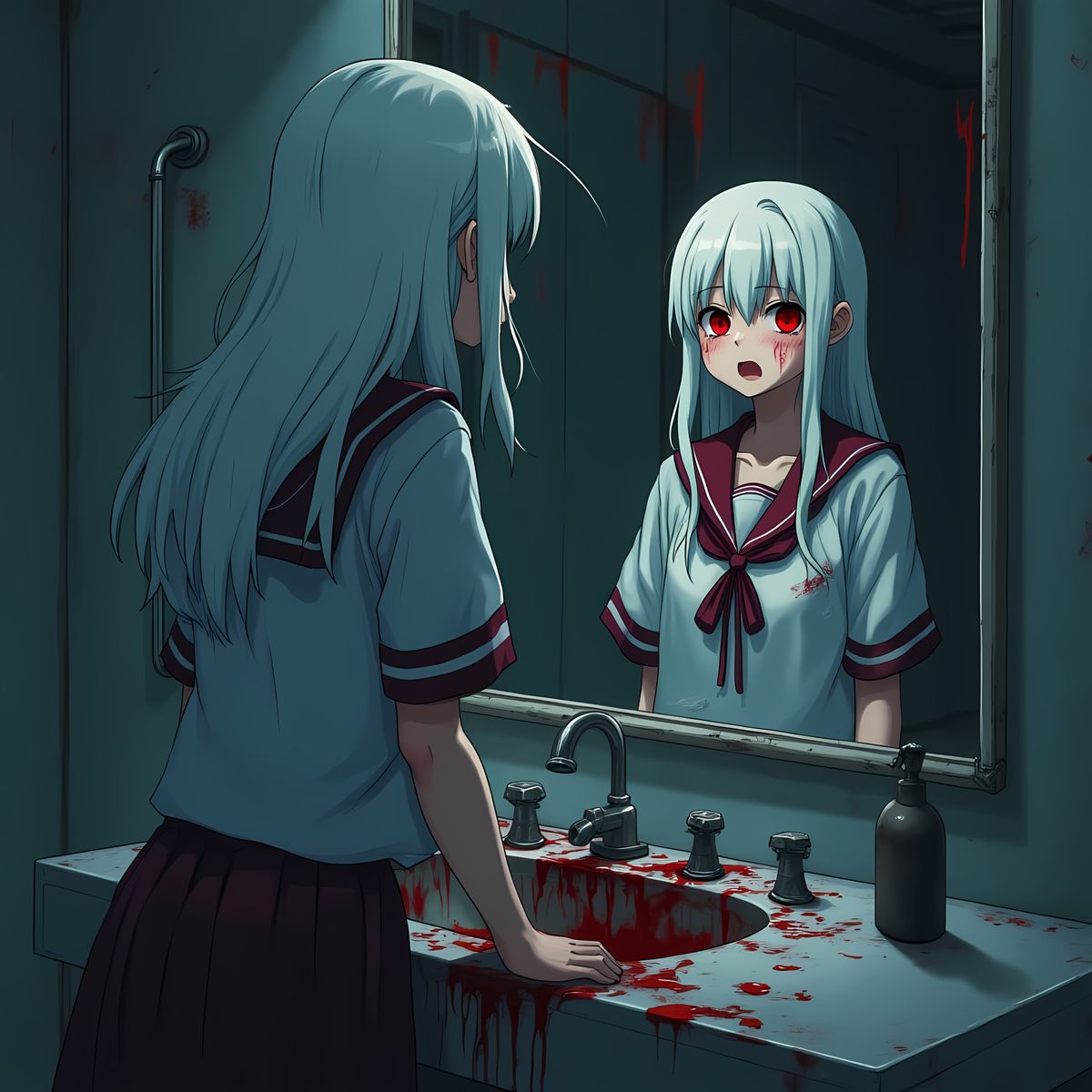 This haunting image shows a girl standing at a sink in a dark school bathroom, her red eyes fixed on the mirror as she cries. Painted in an anime aesthetic reminiscent of 1980s Japanese manga, the scene is a chilling mix of horror and despair.