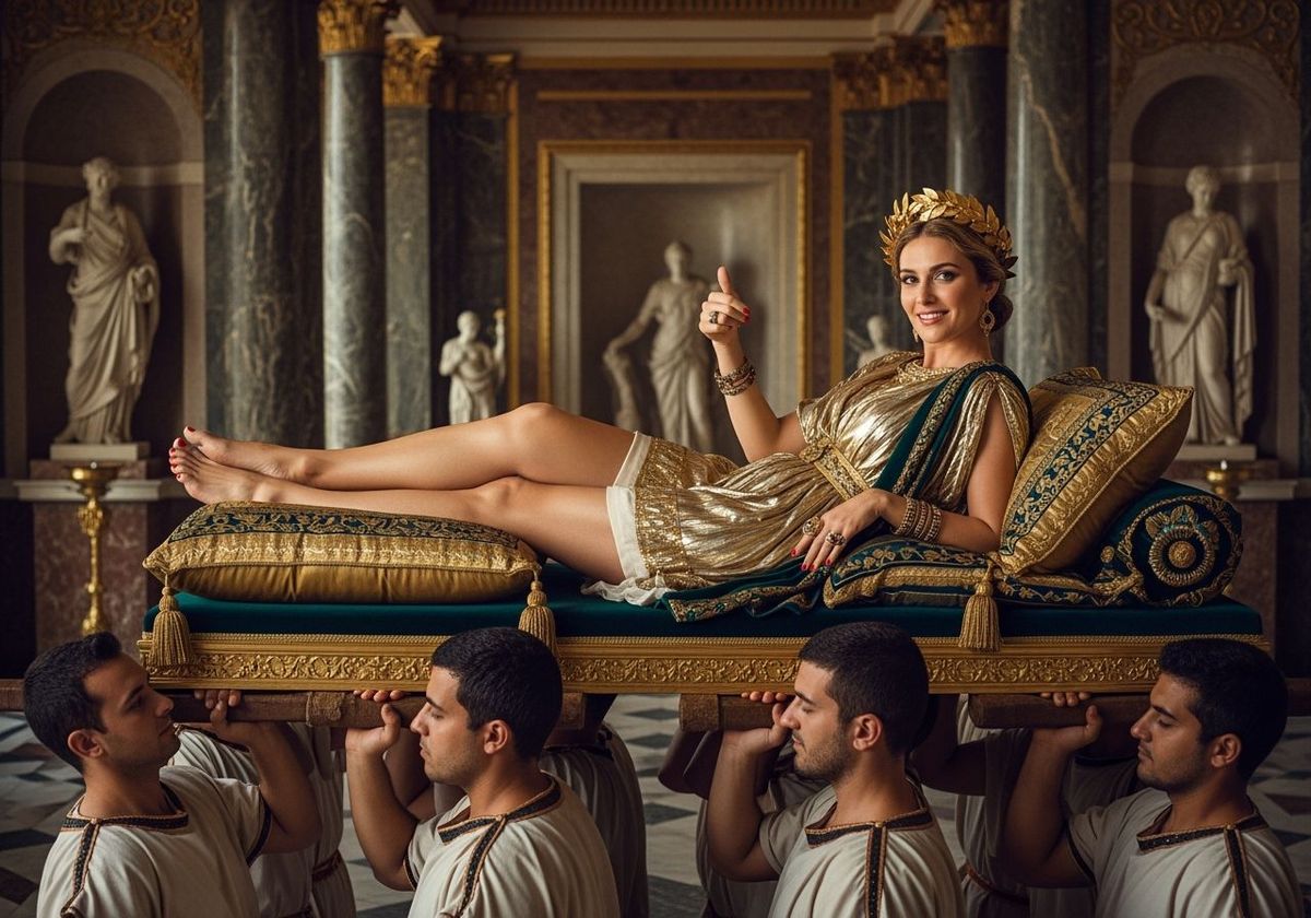 This image shows a Roman Empress carried on a gold litter by servants in an Ancient Rome palace. The empress wears a gold and emerald toga and wreath in this photorealistic image. The style evokes professional photography with natural lighting and sharp focus.