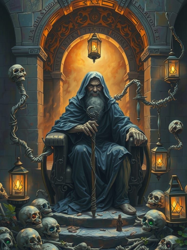 A haunting dark fantasy image of a necromancer sitting on a decrepit throne, surrounded by eerie fog, ancient runes, and macabre architecture, with a sinister grin and twisted magic staff. Rich, unsettling colors create an ominous atmosphere.