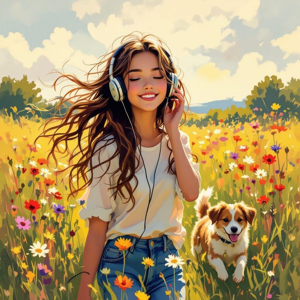 This image shows a teenage girl with wavy brown hair walking through a sunlit meadow filled with wildflowers, listening to music while a puppy plays nearby. The image has a painterly, impressionistic style.