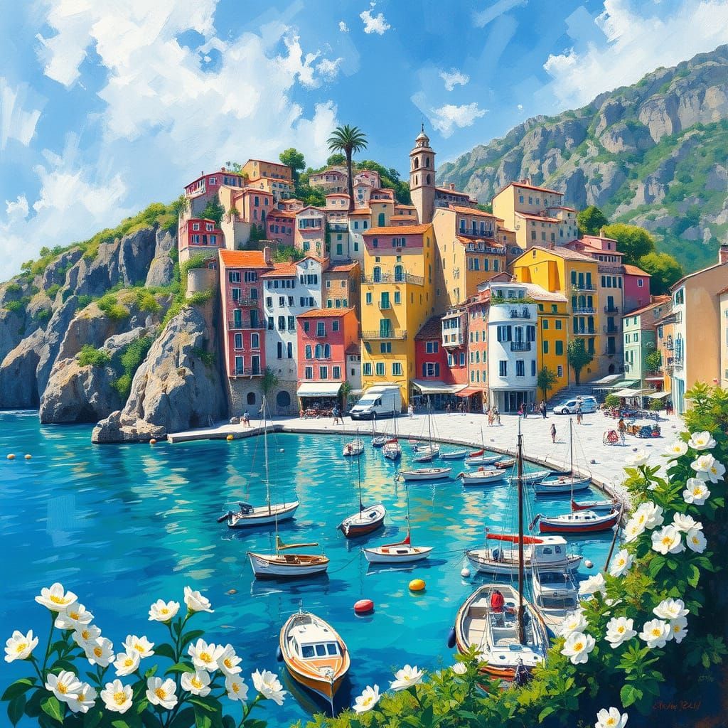 A vibrant image of an Italian village on the Amalfi Coast, featuring colorful buildings and fishing boats. The artwork evokes impressionist paintings with luminous colors.