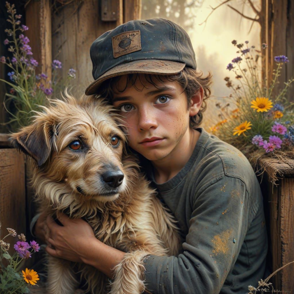 A close-up oil painting of a boy hugging a dog. The boy wears an old cap and sits on a wooden bed surrounded by wildflowers. Earthy tones and warm lighting create a melancholic mood in a painterly style.
