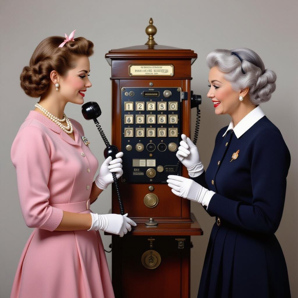 This image shows two women in a mid-century scene using a vintage telephone switchboard. The photorealistic style, reminiscent of classic photography, features muted colors and emphasizes texture and lighting.
