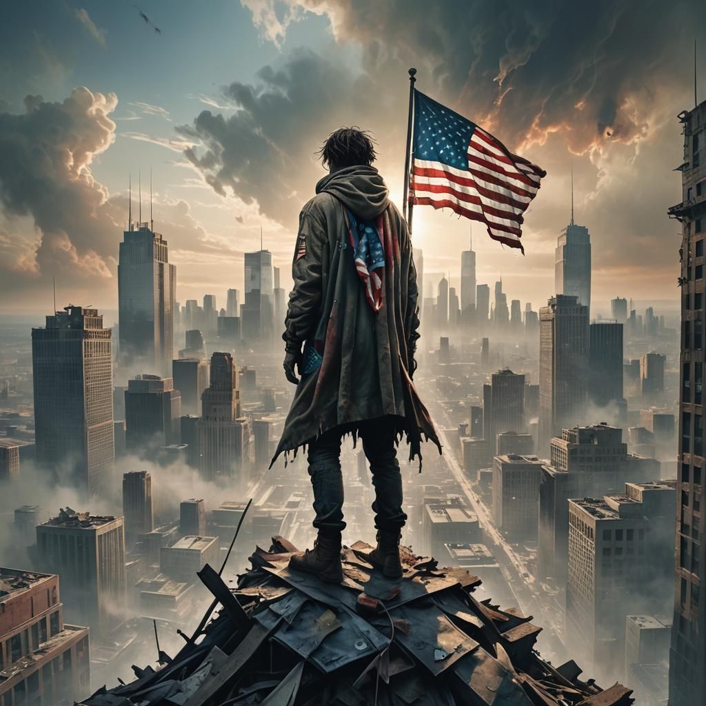 This image shows a solitary figure standing on a tattered American flag atop a ruined skyscraper, overlooking a decaying city. The scene is rendered with muted colors, dramatic lighting, and a haunting, dystopian atmosphere.