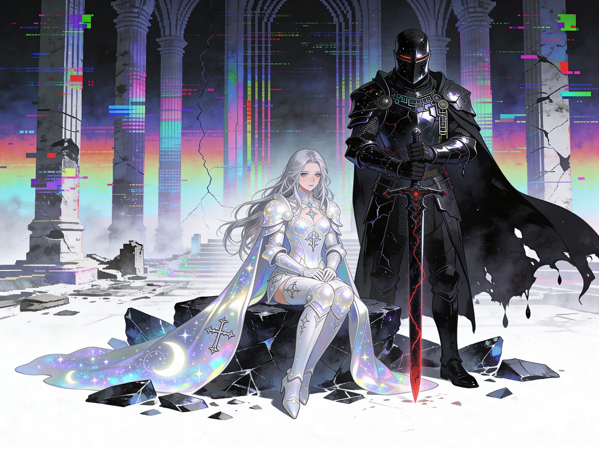 This image shows two knights, one in white armor and one in black, in a surreal digital wasteland. Features glitch art and retro-futurist elements.