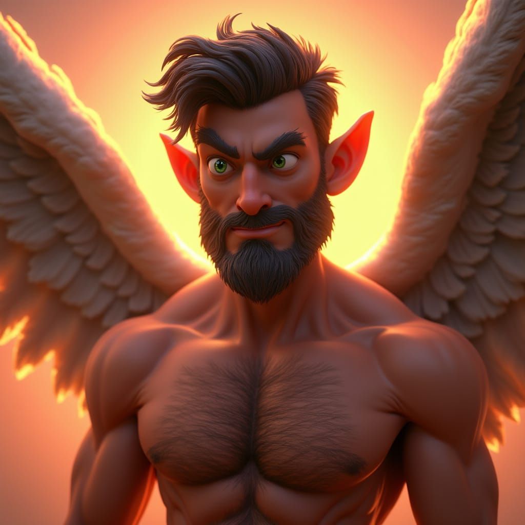 A striking picture of a muscular, brown-skinned angel with a hairy chest and green eyes. This 3D rendered digital art piece features cinematic lighting, intricate textures and vibrant, radial gradients.