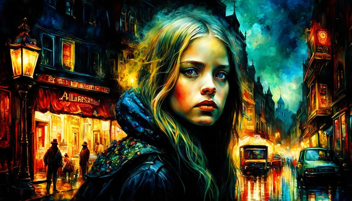 Painting by Alexander Jansson, double exposure: portrait of a young woman in a down town, a hyperdetailed painting done with alcohol inks, deep color, expansive, surrealism. Horror Gustave Doré Greg Rutkowski