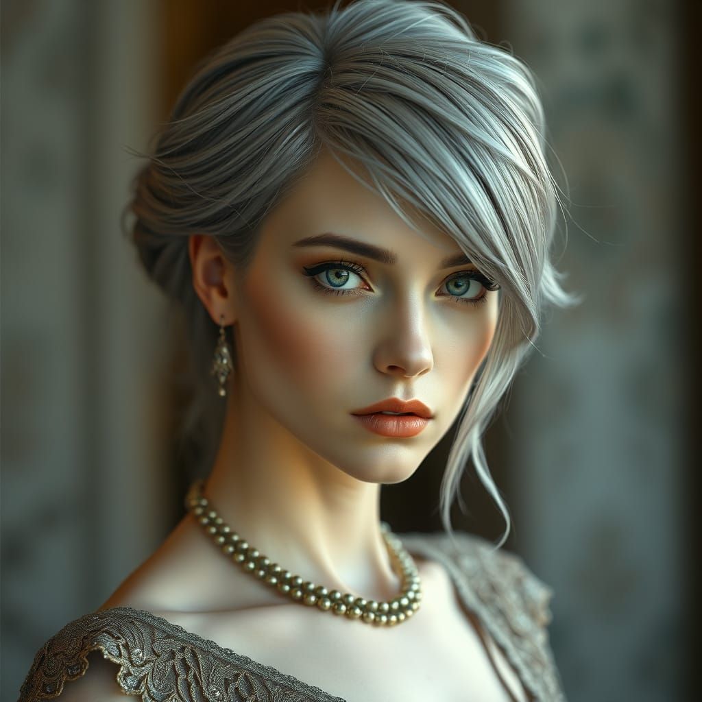 A portrait of a woman with feathered gray hair, porcelain skin, and blue eyes. She is dressed in elegant attire with intricate details, in the style of classic oil painting.