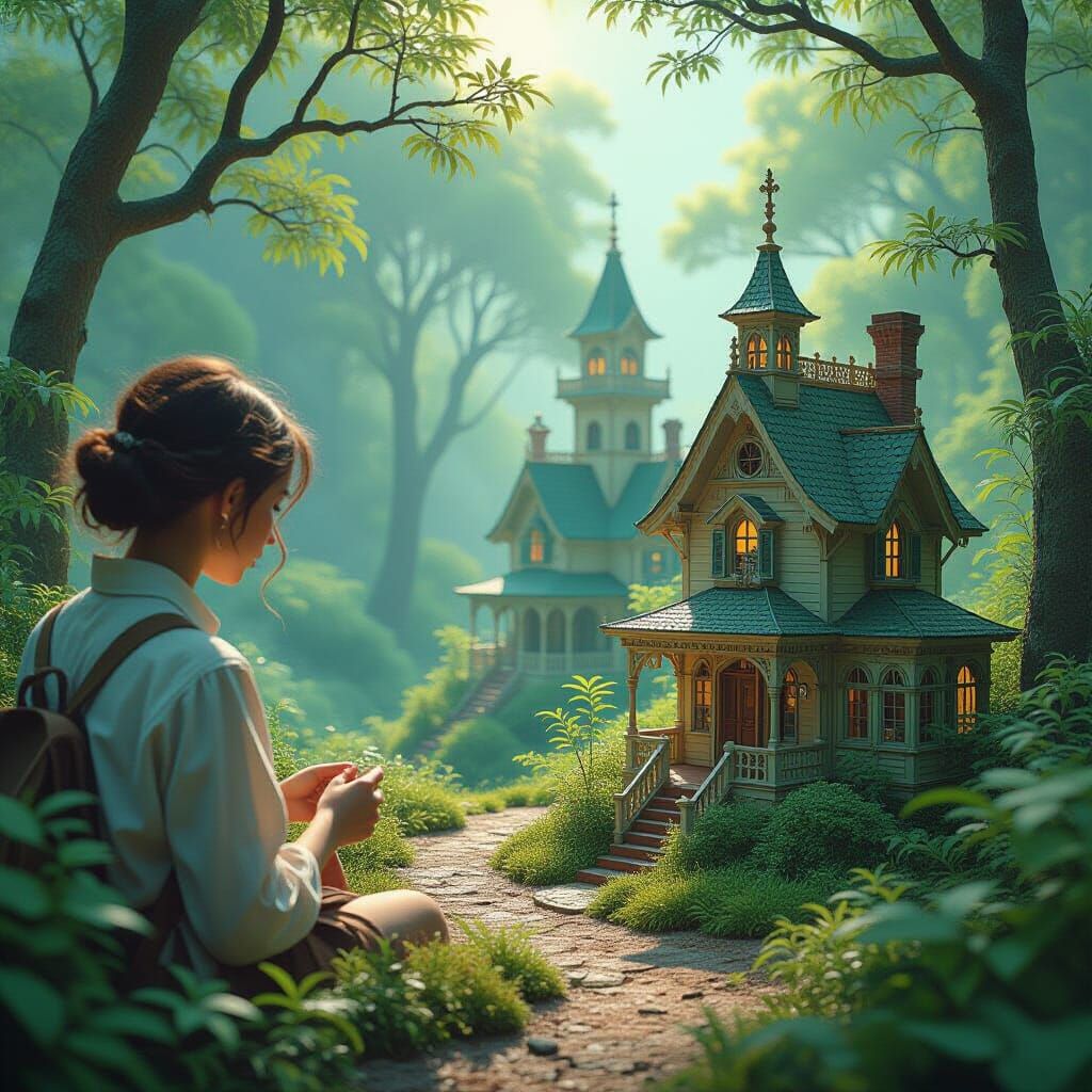 A captivating scene of a person discovering miniature worlds hidden within lush forests and ornate architecture. The image evokes a fantastical and dreamlike quality, rendered as vibrant digital art.