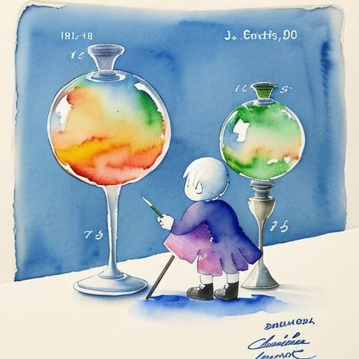 This image shows a child's watercolor drawing of a famous patent. The artwork is simple, colorful, and childlike in its execution, capturing the essence of the invention.