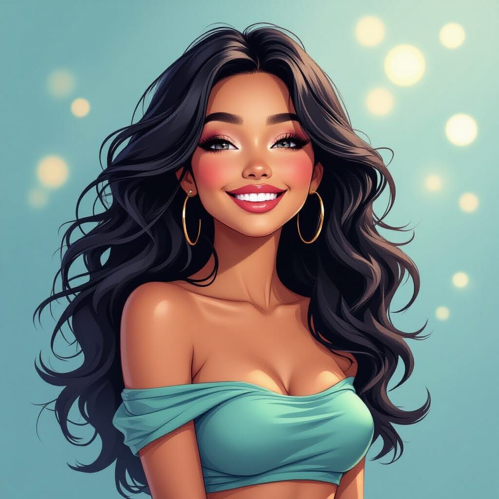 A digital painting of a Latina woman with dark wavy hair and blue eyes, laughing joyfully. This detailed matte painting captures her vibrant energy and confidence against a soft gradient backdrop.