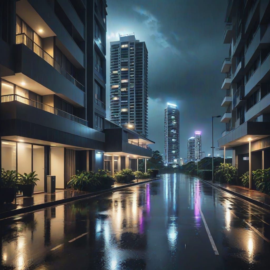 This nocturnal scene captures the glistening high-rise units of the Gold Coast, QLD, bathed in the soft glow of moonlight after a torrential rain. Deep shadows and cool, desaturated hues create a moody atmosphere, while reflections dance across wet surfaces.