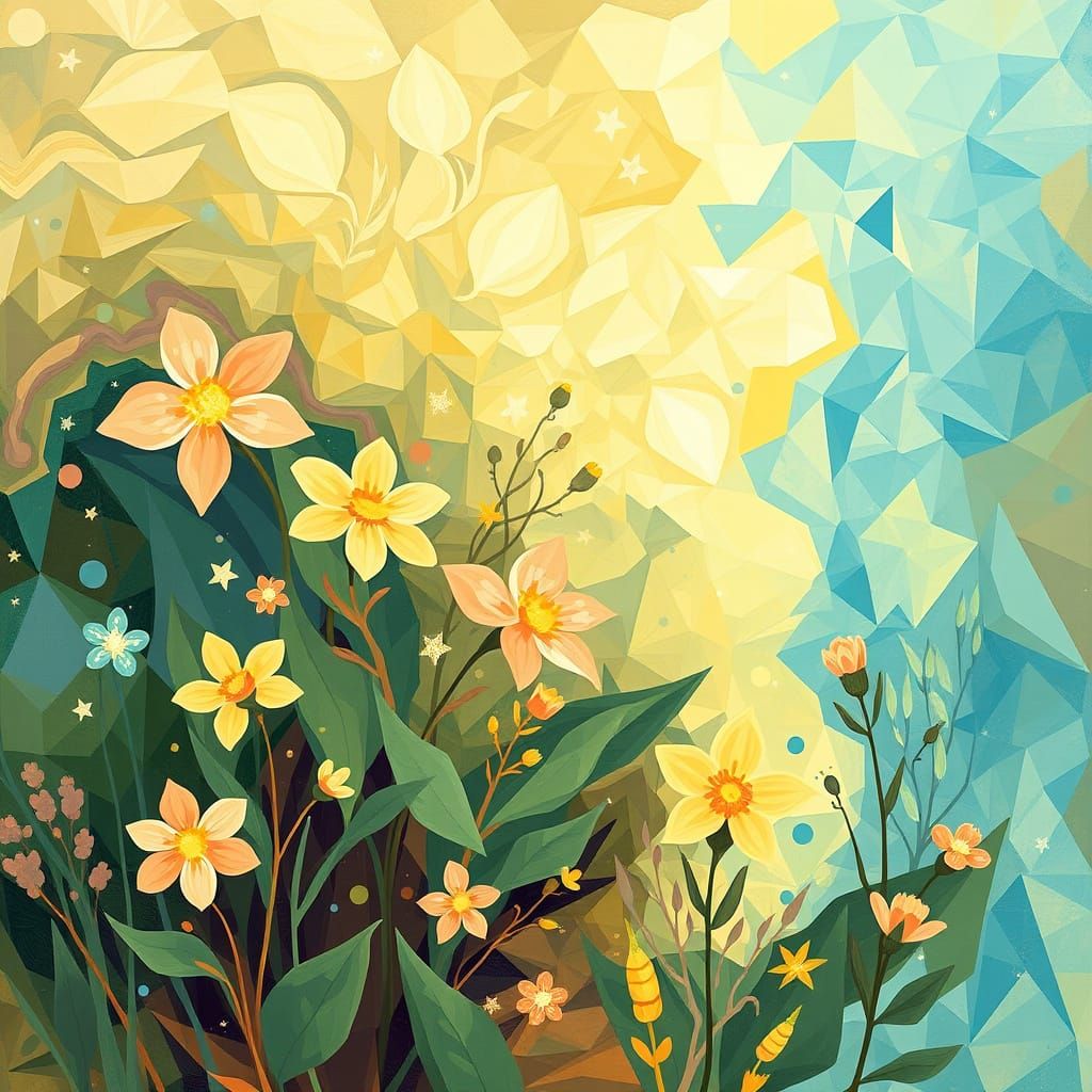 A vibrant image displays an impressionist garden filled with tessellated flowers glowing like stars. The artwork features swirling impasto strokes and a palette of lemon, rose gold, and aquamarine.