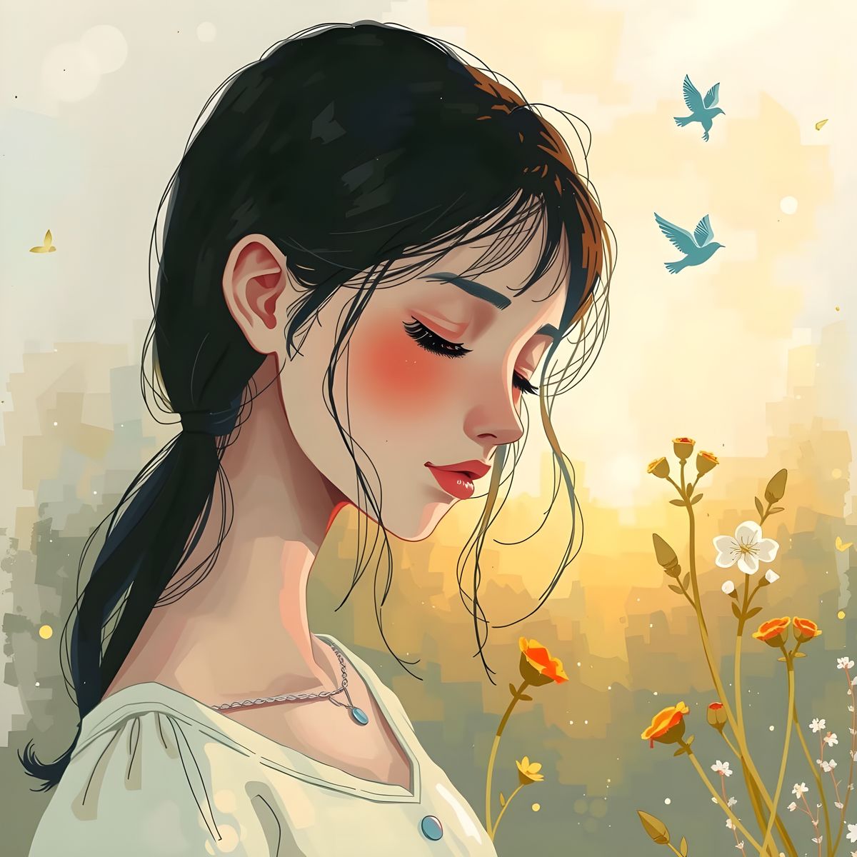 A serene young woman surrounded by muted colors releases a bird into a warm, sunlit garden, symbolizing hope and renewal in a beautifully expressive and imaginative scene
