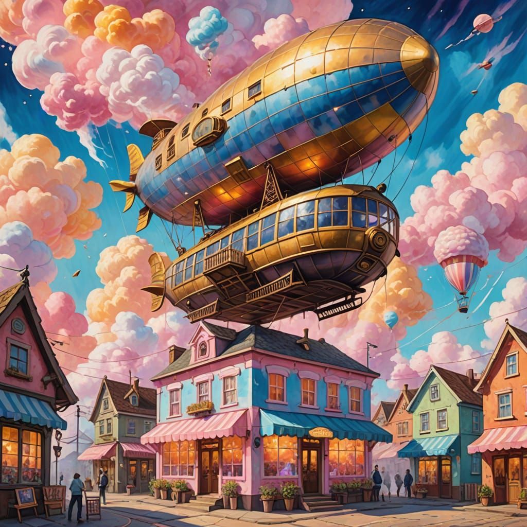 A vibrant airship floats over a fantastical cotton candy shop in this gouache-style image. The scene is depicted with thick brushstrokes, impasto textures, and warm golden lighting.