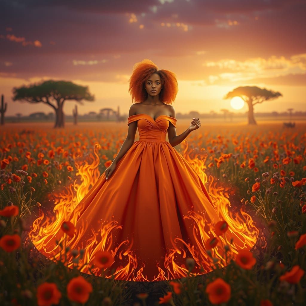 A striking image of an African woman with voluminous orange hair, wearing a dramatic burnt orange gown, standing regally in a field of orange flowers at sunset. Ethereal and powerful atmosphere.