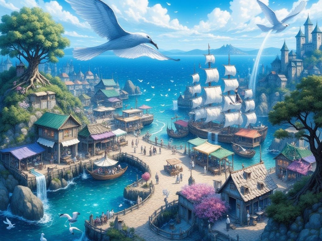 This image shows a serene fantasy harbour scene with a merchant fleet and festival plaza. The digital pixel art features intricate details and a wide ocean horizon, reminiscent of a 32-bit JRPG.