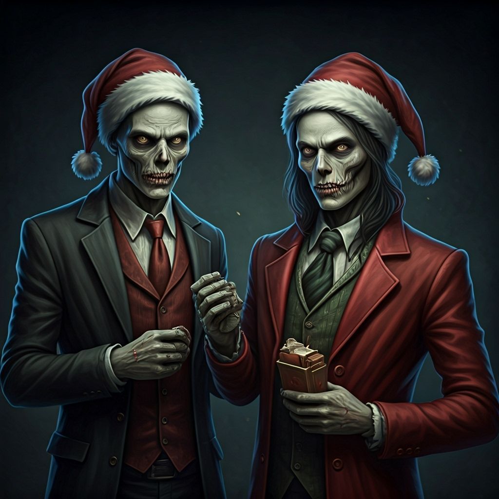 This image depicts a group of undead carolers performing eerie holiday songs. The scene captures a chilling, yet festive, atmosphere with a touch of macabre.