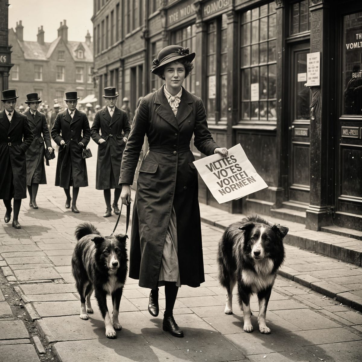 This image shows a woman marching down a London street in 1918, holding a sign that reads "Votes for Women", accompanied by her collie dog in vintage style.
