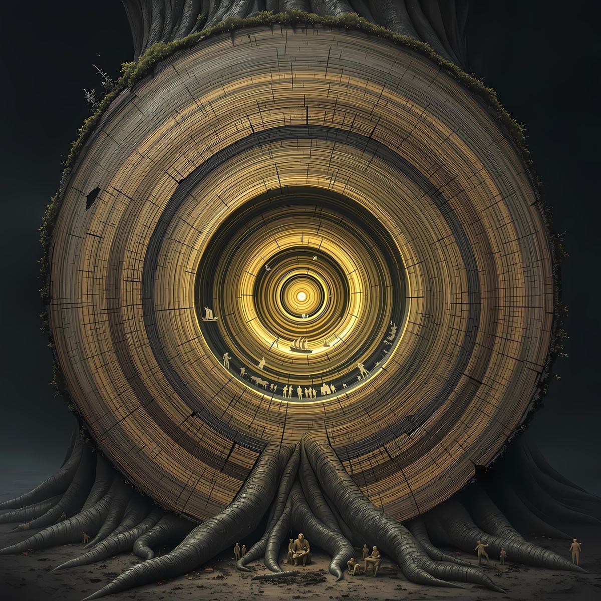 This image depicts a surreal, cross-sectioned tree trunk, where historical scenes from ancient forests and mythology are embedded within its growth rings, creating a mystical and timeless atmosphere.