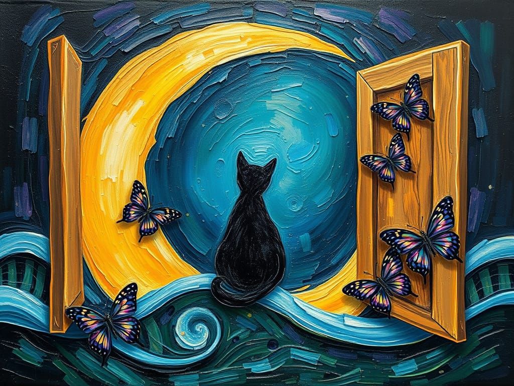 This captivating image shows a whimsical scene of a cat sitting on the moon, surrounded by iridescent butterflies and a dreamlike atmosphere, rendered in a unique blend of neo-impressionist and expressionist styles with thick, textured brushstrokes and a palette of gold, dark blue, and purples hues.