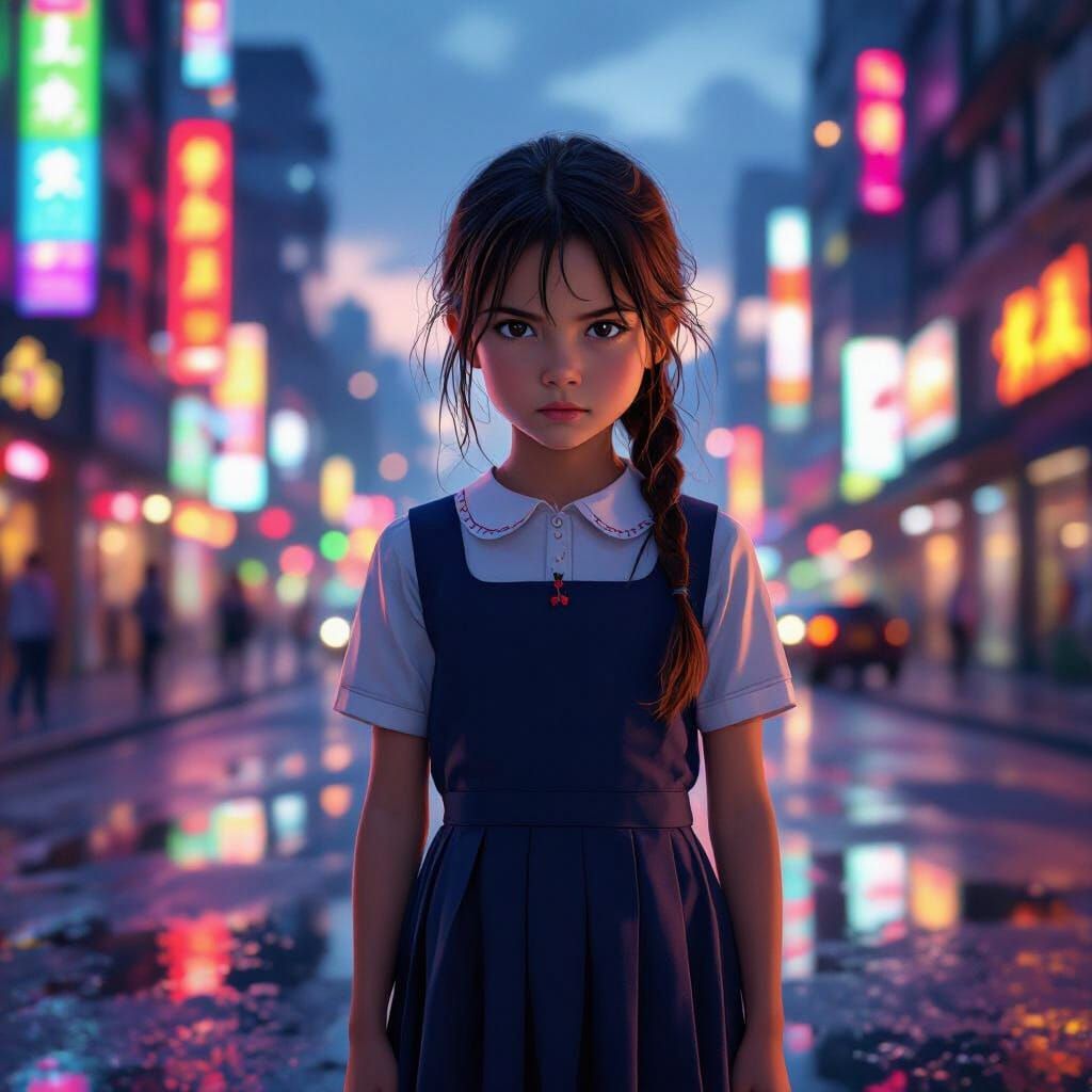 This photorealistic image showcases a determined young girl in a school dress, standing before a vibrant, neon-lit cityscape at twilight. Cinematic lighting highlights the wet street reflections.