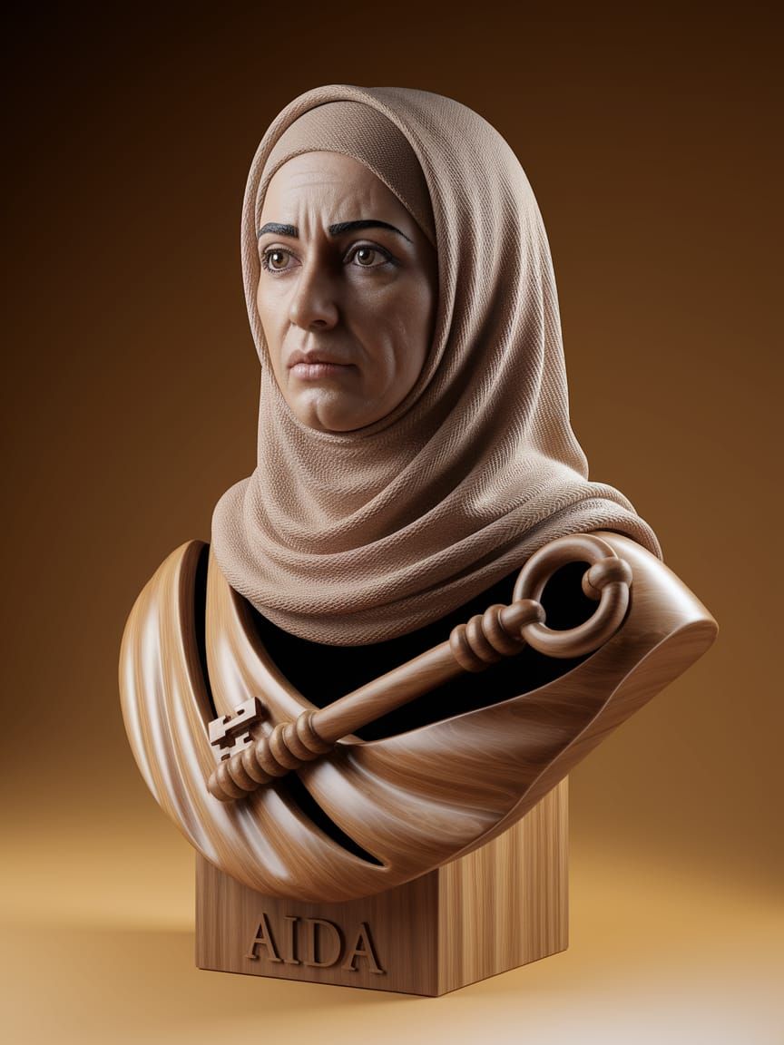 This image features a photorealistic 3D render of an olive wood bust of a Palestinian woman named Aida. A symbolic ancient key is carved into the wood, evoking melancholic longing and memory.