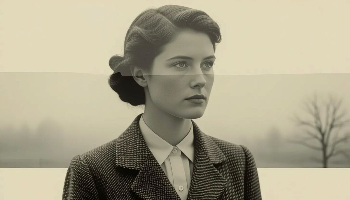 This image shows a vintage-style double exposure collage reminiscent of magazine prints. Overcast haze and fragmented elements create a dreamlike, quiet layering effect.