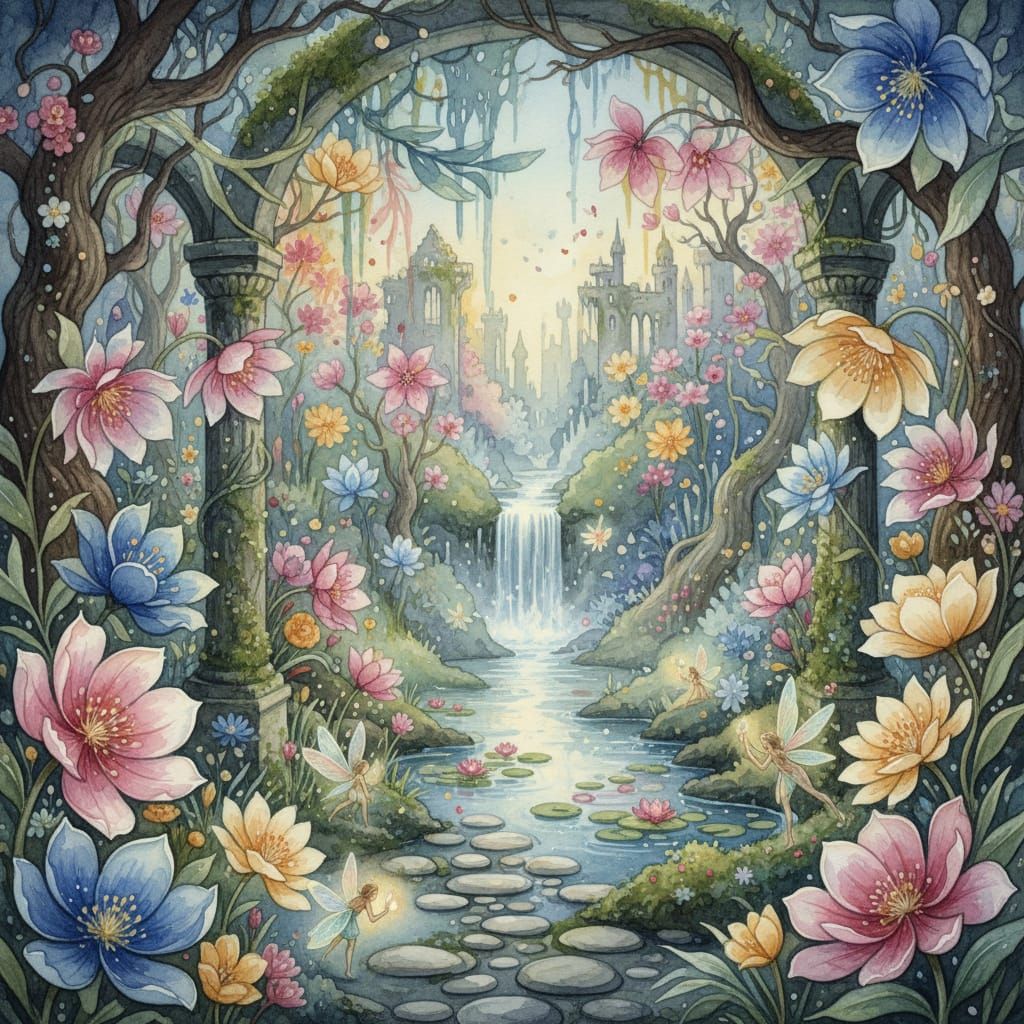 This image depicts a secret flower garden with an ethereal fantasy theme, rendered in detailed watercolor style. Explore a magical, hidden natural sanctuary.