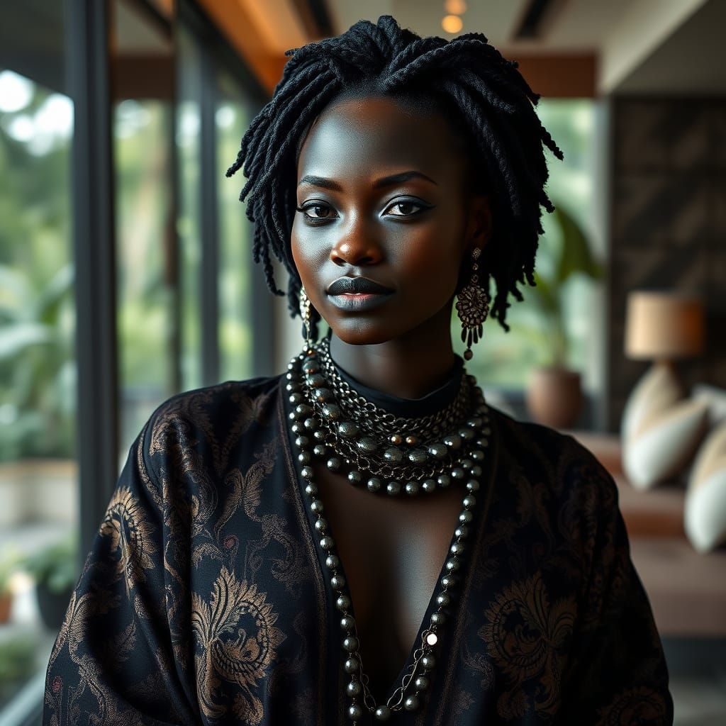 A striking picture of a Black woman in stylish streetwear with granite details, set in a modern hotel. Professional photography techniques capture the subject with sharp focus and natural lighting, in a contemporary style.