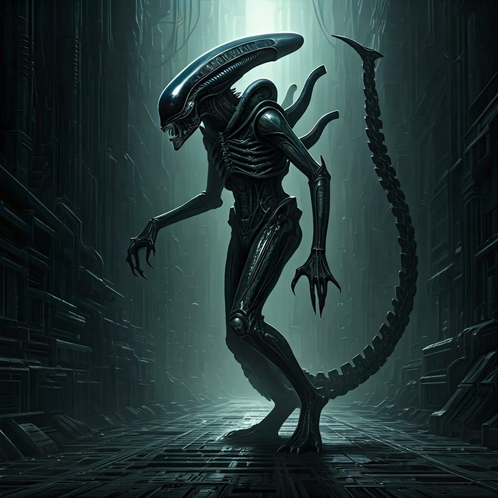 A striking picture of a Xenomorph in an industrial alien landscape. The creature's dark, glistening body and spindly tail evoke a sense of foreboding in a biomechanical surrealism style.