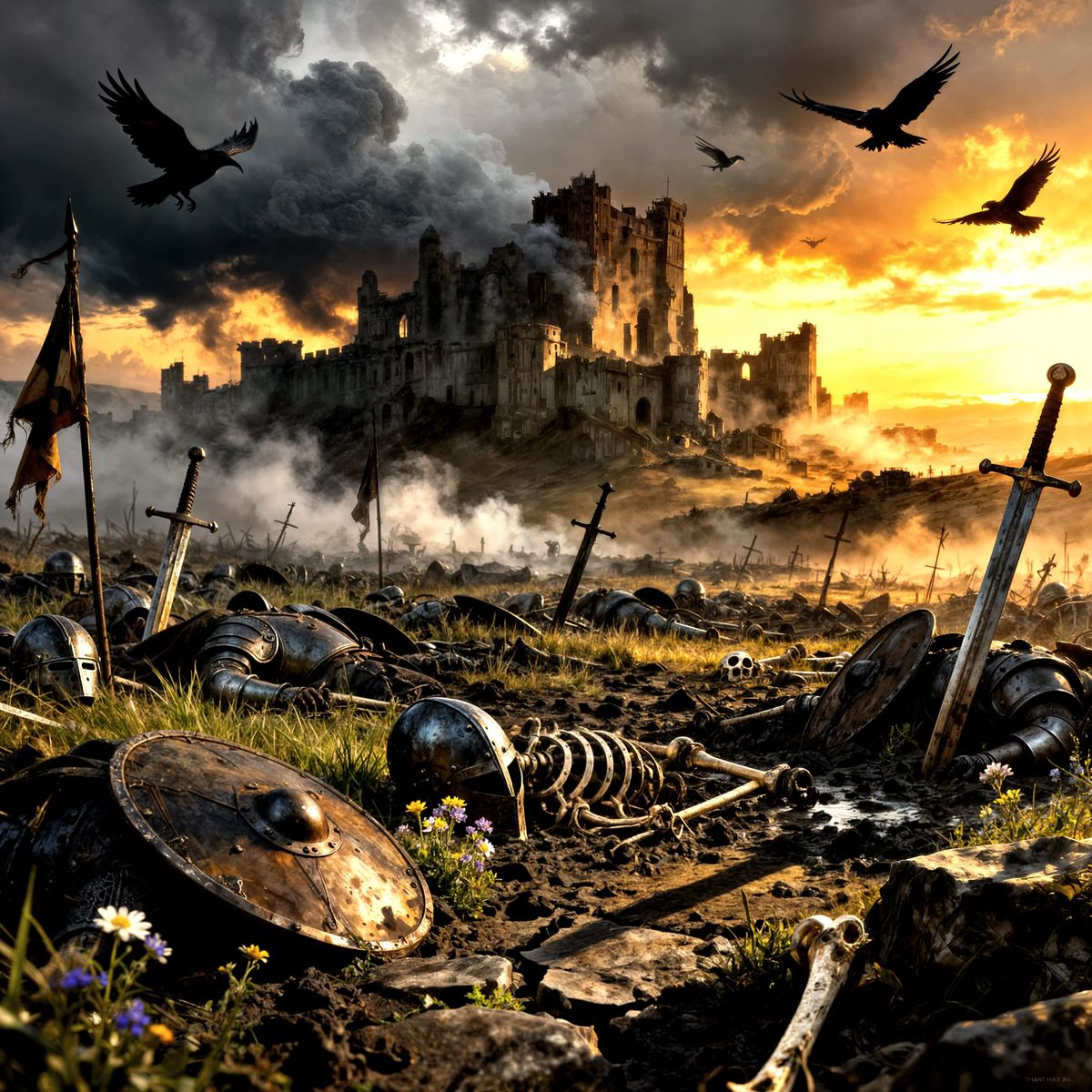 This hyper-realistic oil painting depicts a hauntingly beautiful abandoned battlefield. Rusted weapons, broken armor, and skeletal remains lie half-buried in mud, illuminated by a dramatic sunset. Crumbling ruins and circling ravens add to the epic, emotional scene.