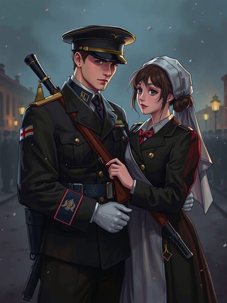 This poignant image depicts a romantic couple from a classic novel set during World War I, rendered in a stylized anime aesthetic with cinematic lighting and deep colors, reminiscent of a cel-shaded masterpiece.