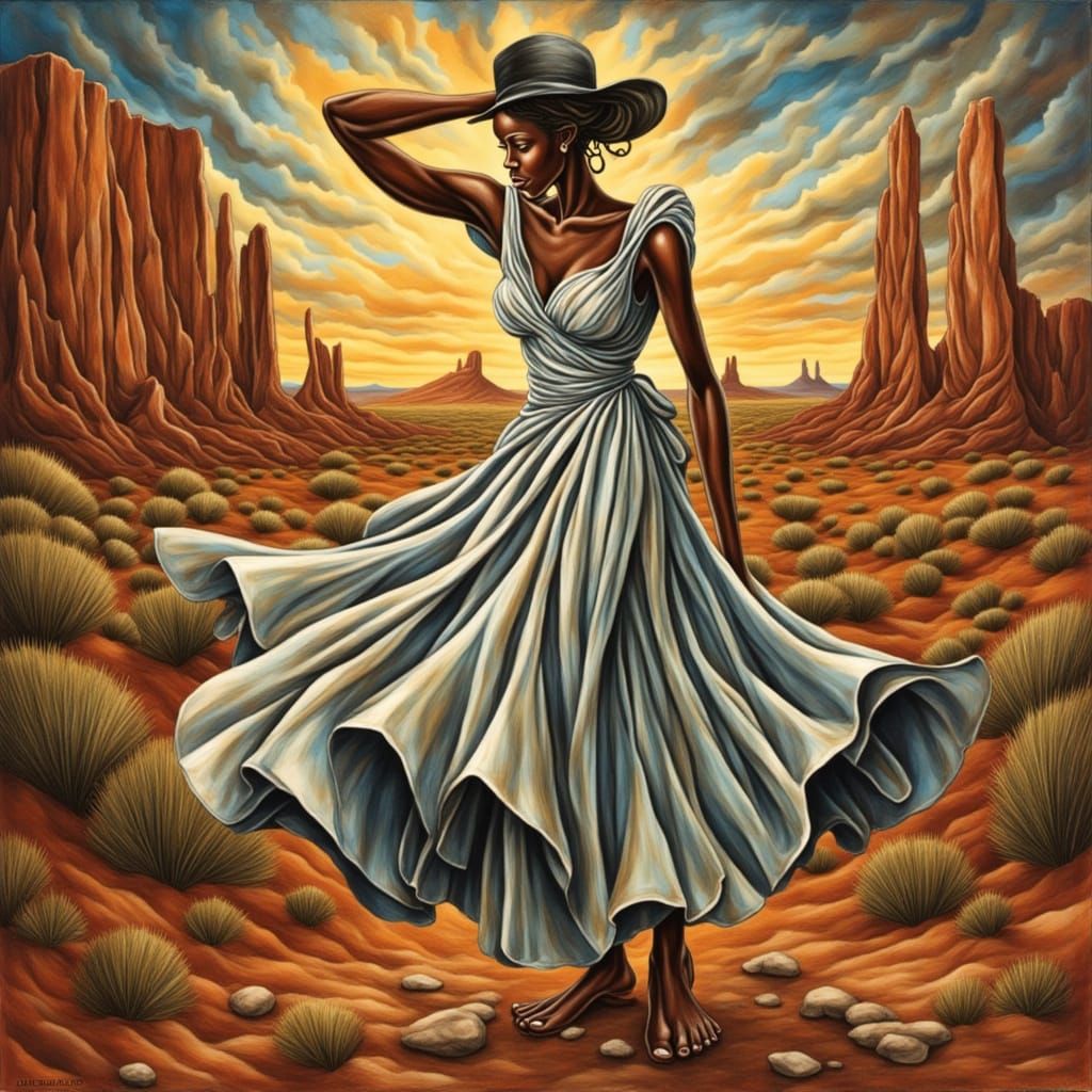 This image shows a barefoot dancer in a silver gown, set in a glowing desert canyon, rendered as an impasto oil painting. The artwork uses a neo-impressionistic and expressionist style.