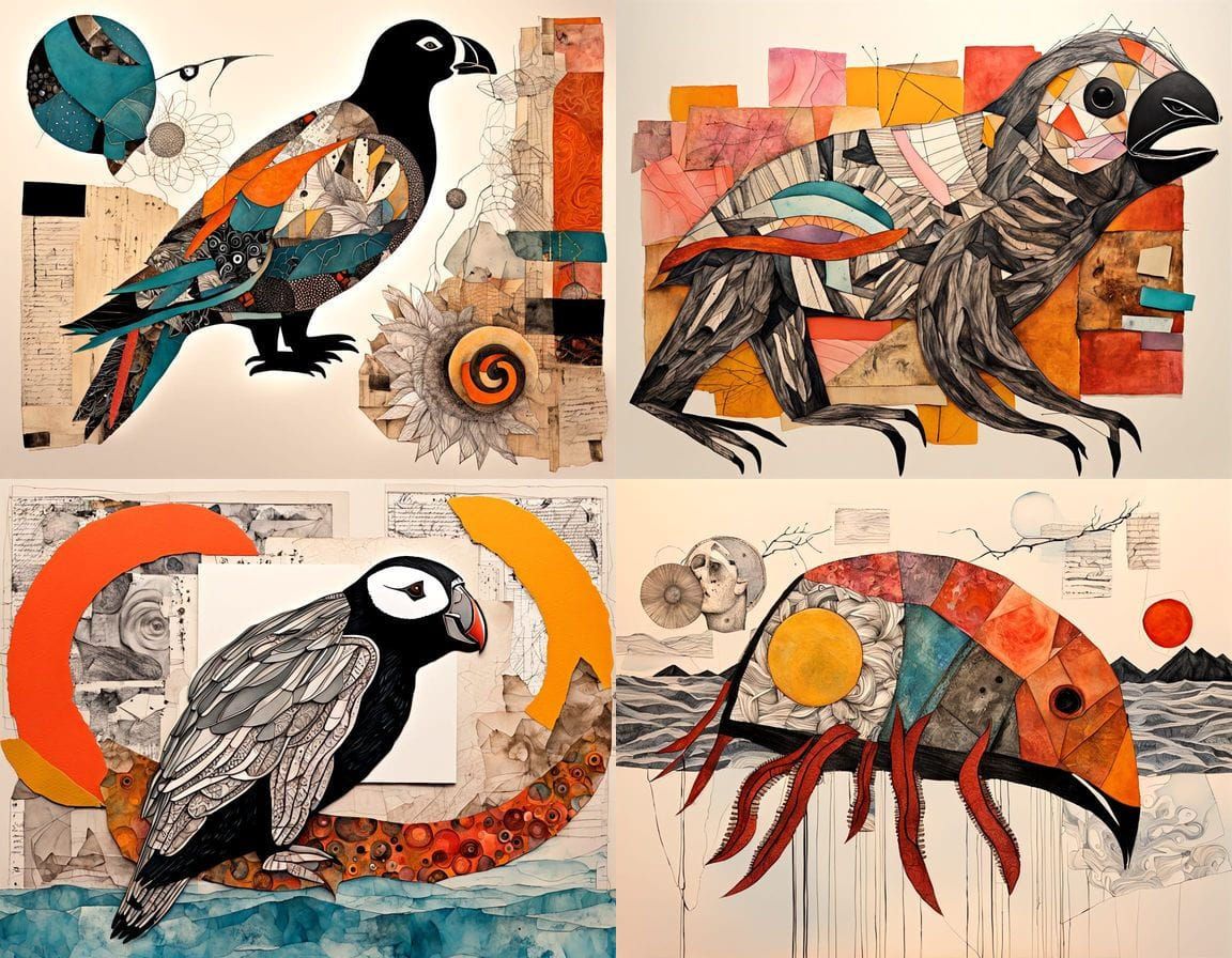 This image shows a bizarre hybrid creature formed from various animal parts. The artwork features a layered mixed media style with painted paper collage and faded line drawings in three dimensions.