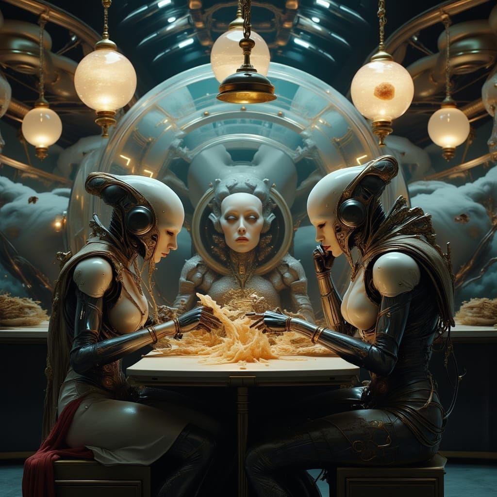 This image captures a bustling noodle shop in a neon-lit night market, surrounded by futuristic cityscapes and diverse patrons, blending human and cybernetic elements in a vibrant, high-tech atmosphere.