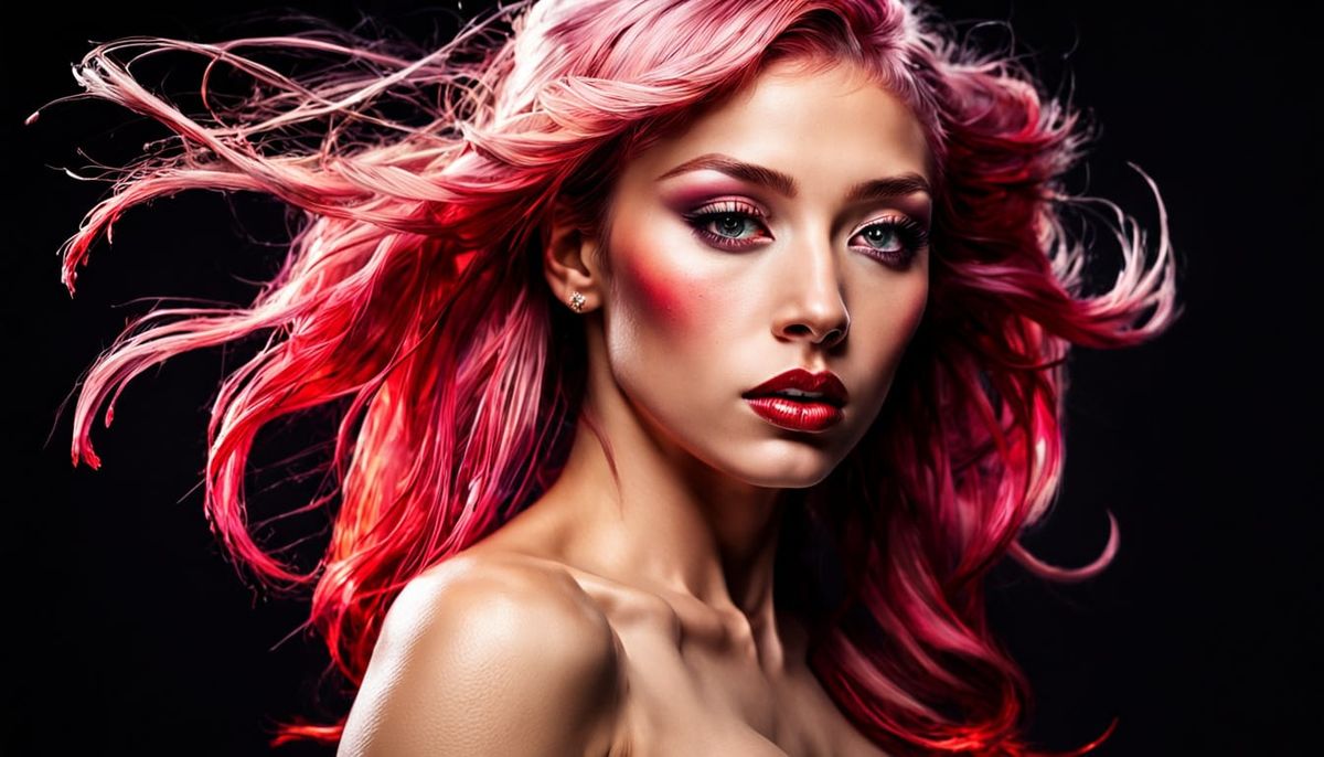This image depicts a hyper-realistic pin-up style woman with pink hair. The artwork emphasizes intricate details, vibrant colors, and dynamic lighting to create a striking and seductive portrait.
