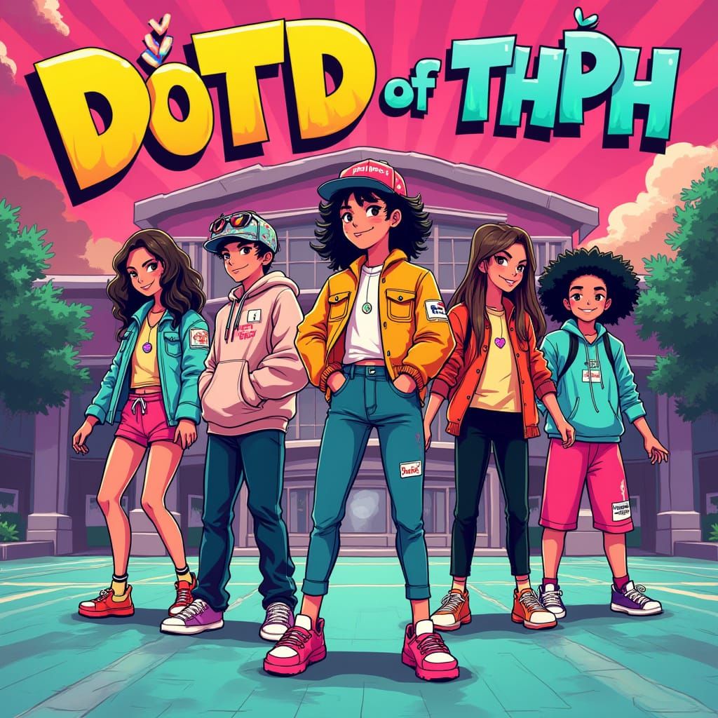 This image showcases a lively dance club scene at Truong Dinh High School, featuring energetic students in trendy outfits, set against a colorful school background, blending hip-hop and electronic dance music influences with a playful anime aesthetic.