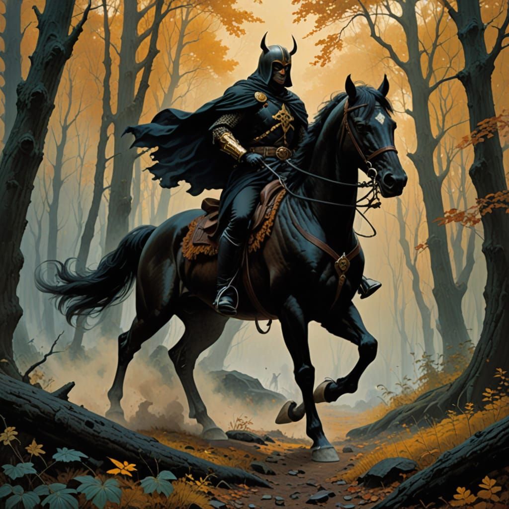 This striking oil painting depicts a heroic masked rider on a black horse prancing through a misty forest, set against a backdrop of vibrant colors and bold brushstrokes, evoking a sense of dynamic fantasy and dark romanticism.