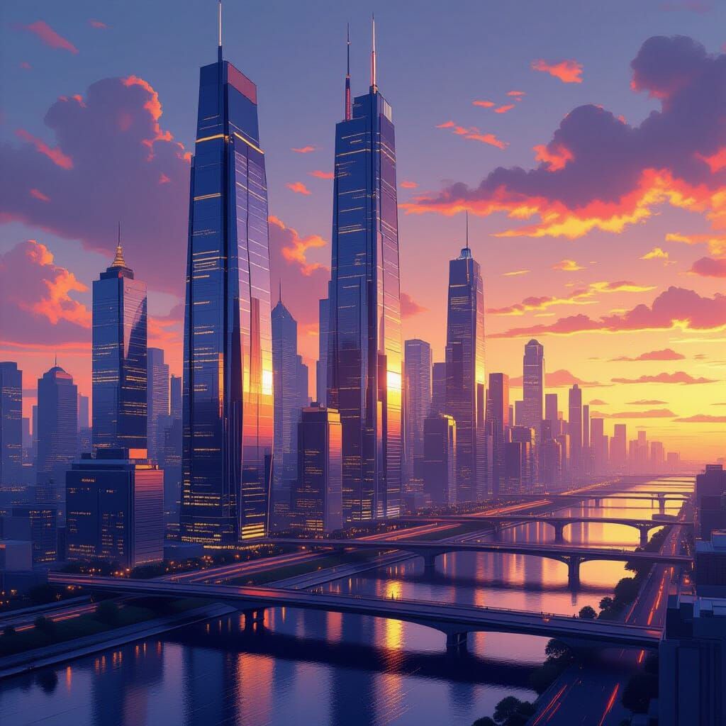 A futuristic cityscape at dusk featuring glass skyscrapers bathed in golden sunlight. The image evokes a retro-futuristic aesthetic with vibrant colors and atmospheric lighting.