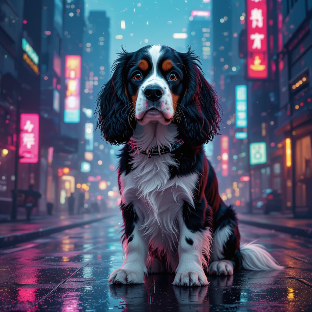 This image features a black and white Cocker Spaniel merged with a futuristic neon city. Created in a detailed matte painting style with vivid, complementary colors.