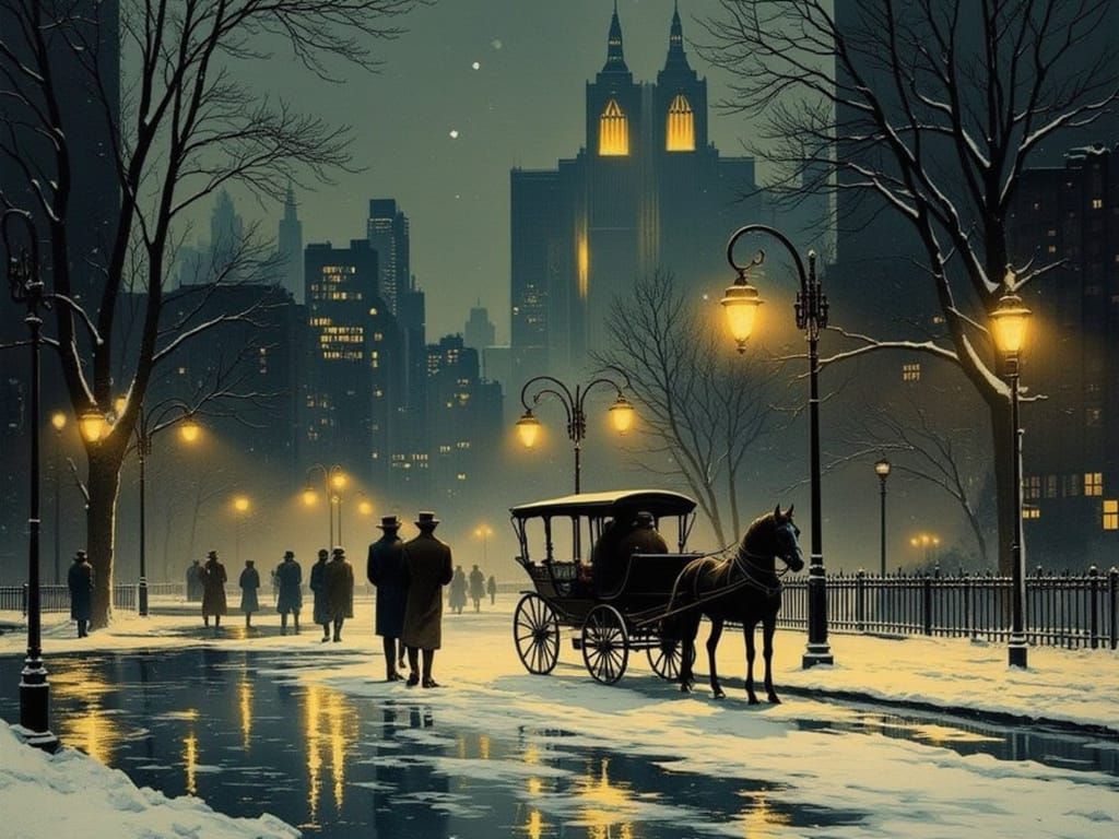 This image captures a moody, vintage illustration of a horse-drawn carriage in a snowy city park at night. Golden street lamps illuminate the scene, with dark skyscrapers visible in the misty background.