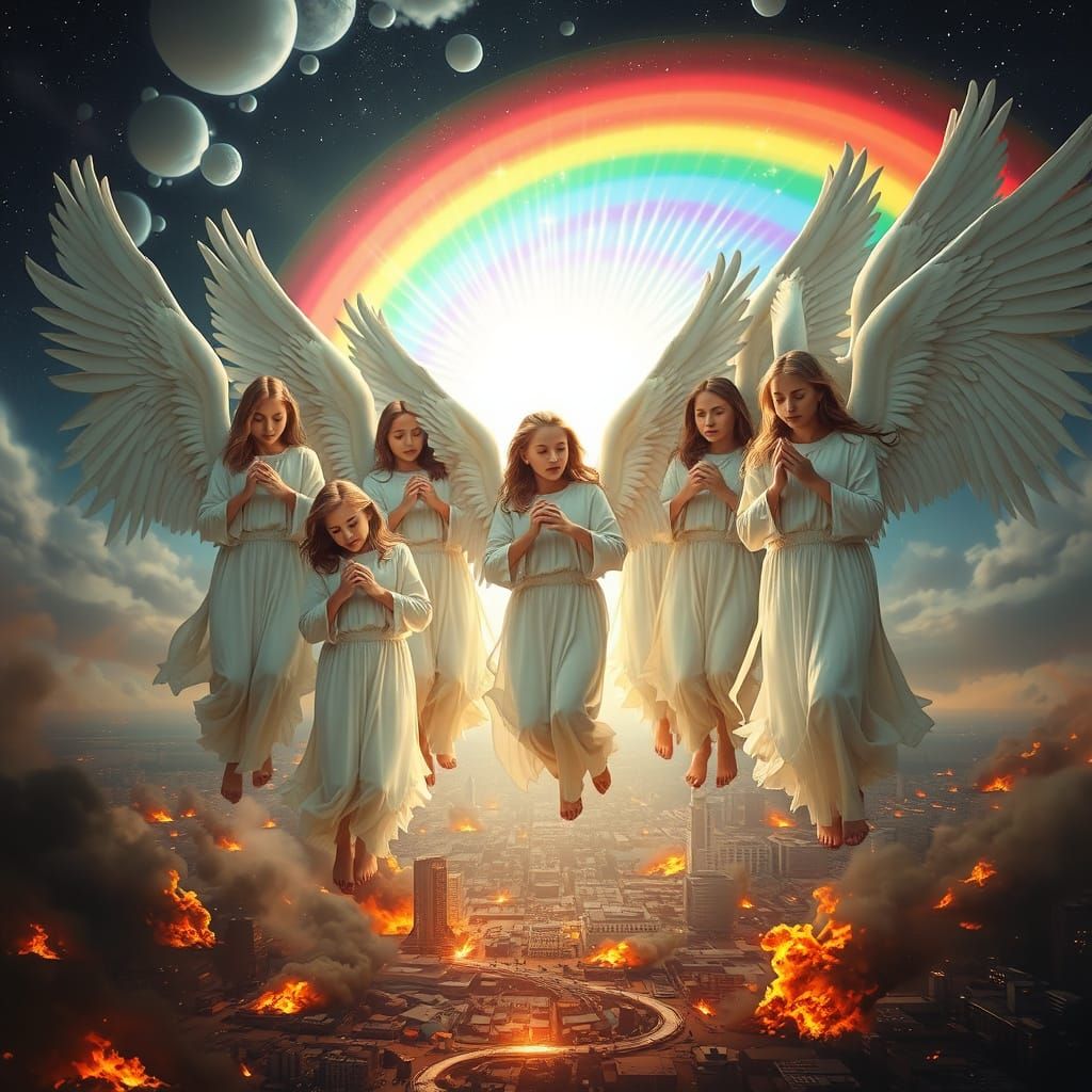 This image depicts 100 guardian angels cradling deceased children as they ascend through a vibrant rainbow spiral into a white circle of light. The scene is set amidst a devastated Earth with burning cities and explosions, yet the angels' compassionate faces and the children's serene expressions evoke a ...