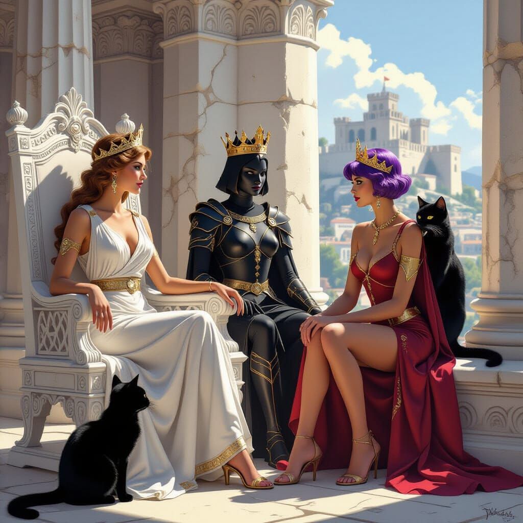 This hyperrealistic image depicts the Queens of Hearts, Clubs, Spades, and Diamonds reimagined as a Greek goddess, medieval knight, black cat, and cheerful girl, showcasing intricate detail and dramatic lighting.