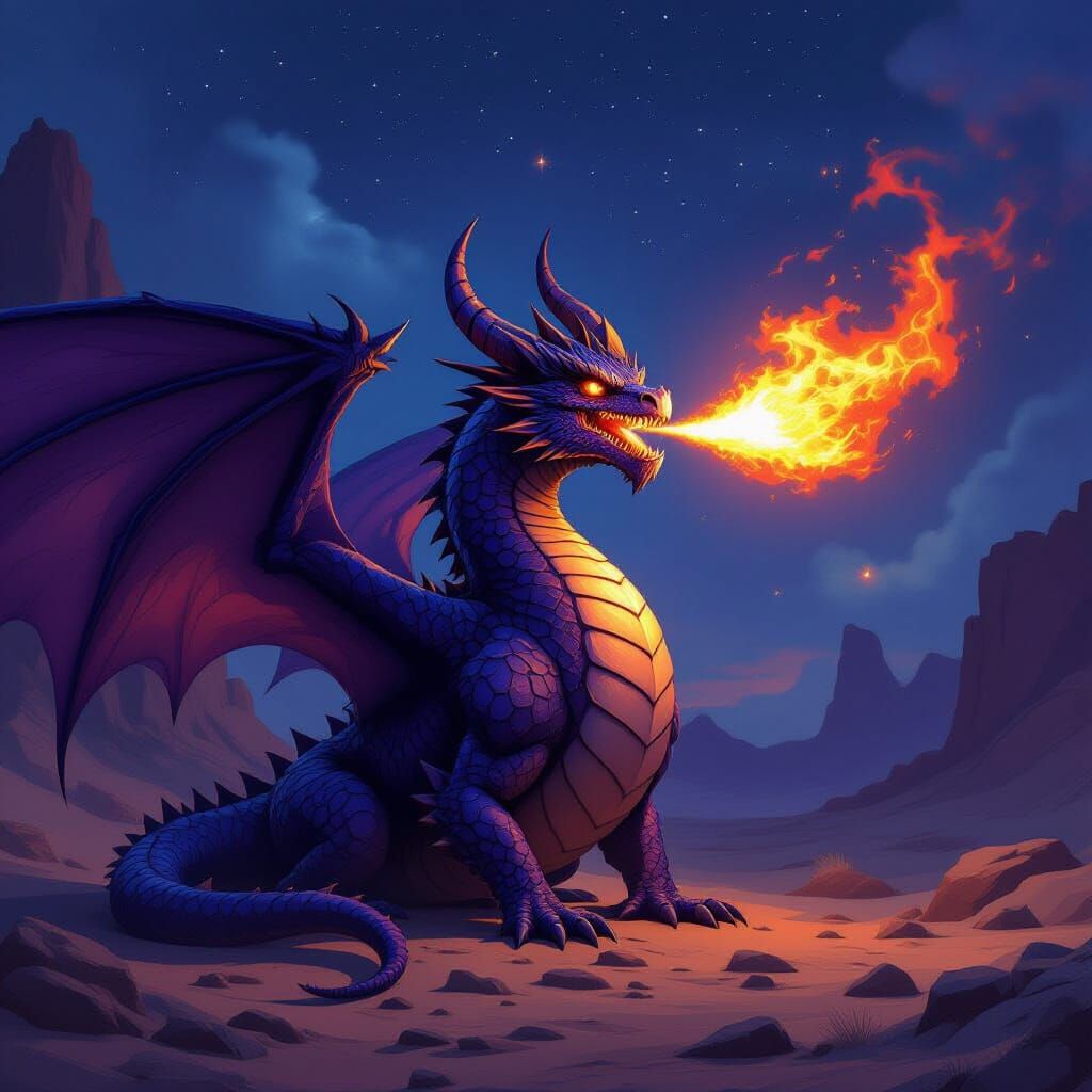 A majestic purple dragon with orange eyes and back spikes unleashes a fiery breath in a dark fantasy concept art style, set against a star-filled desert sky with unfurled wings.