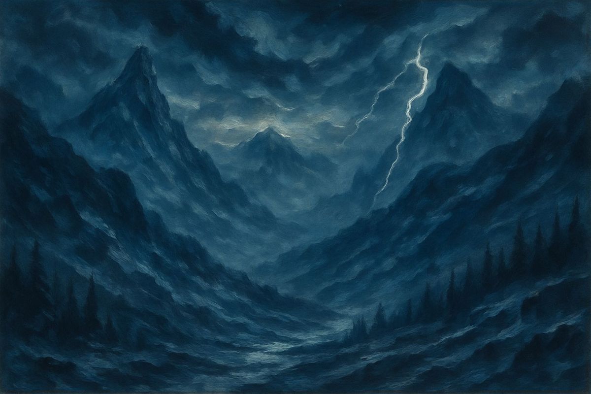 This image depicts a dark, moody landscape of snowy mountains under twilight skies, rendered in a thick, textured gouache and watercolor style with bold brush strokes.