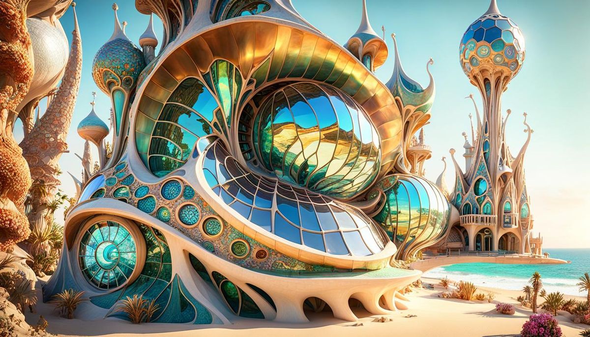 A stunning image of a Gaudi-esque snail house on an alien beach. This psychedelic digital artwork features volumetric lighting, intricate details, and a faded pastel color palette, reminiscent of mother-of-pearl.